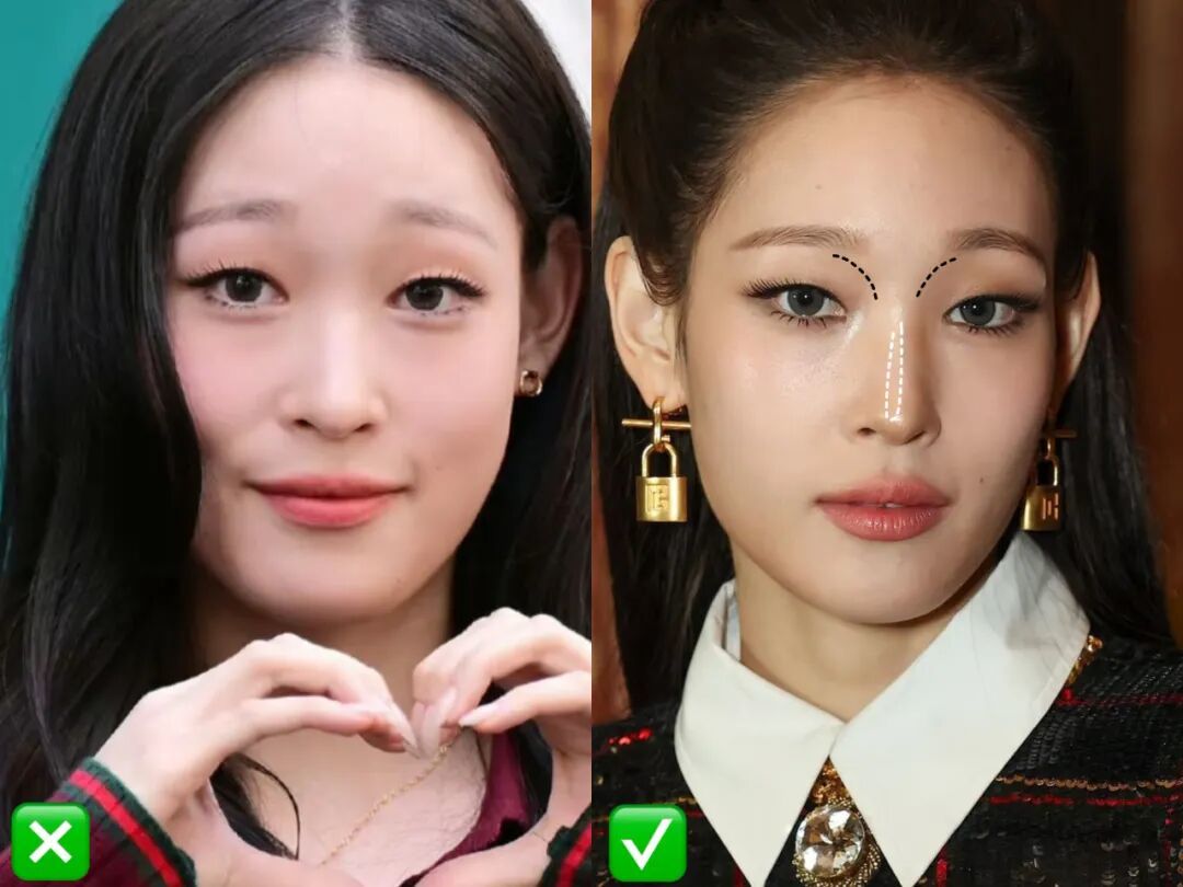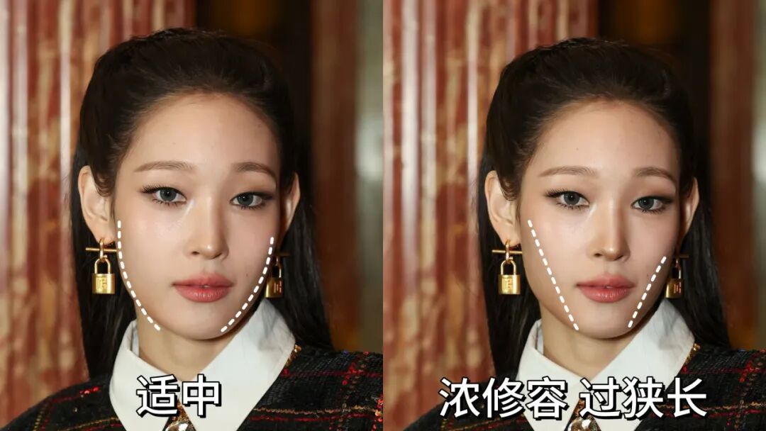 因为过分浓烈和满溢的修容,会让本就狭窄的面部变得更瘦削,纵向比例过长。