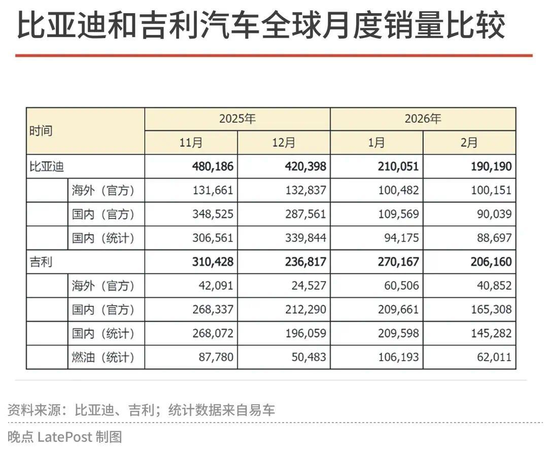 背后的原因并不像数字显现的那么直接。首先,随着 2026 年新能源购置税优惠政策减半,新能源产品在 2025 年底有了一定的透支销售,进入新年会消化这些透支,作为全新能源产品线的比亚迪,受影响最大。而吉利还有燃油车的销售,具备对抗市场风险的纵深,从销量来看,燃油车在 1 月和 2 月发挥了巨大的作用,占到了吉利总量的一半上下。