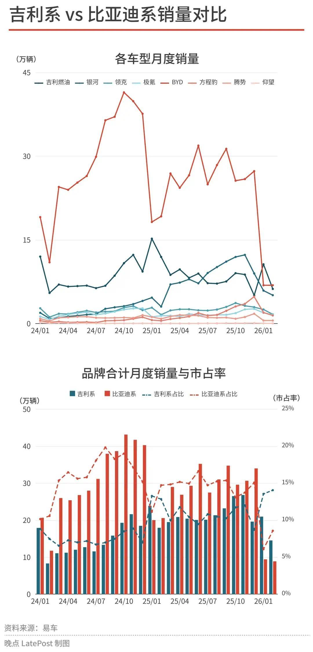 反观吉利,趁此机会,在 2026 年初连续两个月超越比亚迪,登上了自主品牌的王座。