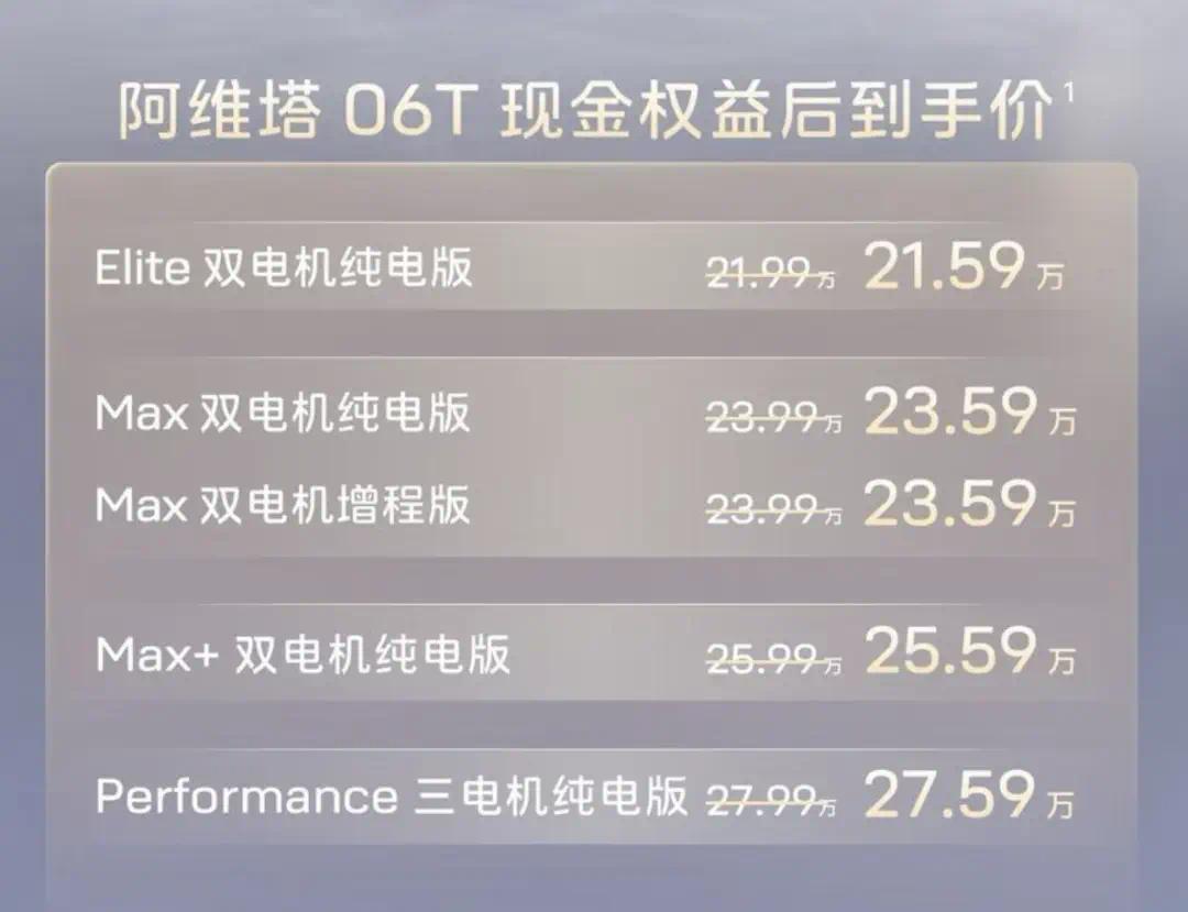 今日(4月22日),定位于智美全场景运动轿车的阿维塔06T正式上市,新车一口气推出5款配置,覆盖纯电、增程双动力,官方售价21.99万-27.99万元,叠加限时现金权益后,入门价直接拉低到21.29万元,一上市就成了20万级市场最受关注的智驾新选手。