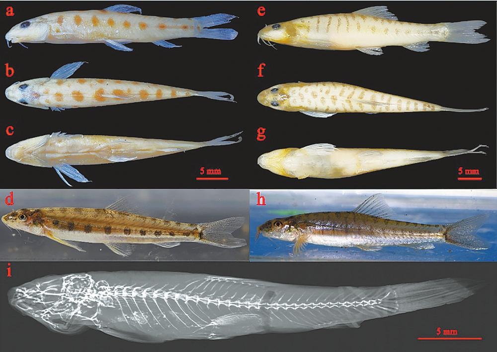 雄性沙迷鳅(图a—图d) 、雌性沙迷鳅(图e—图h)以及沙迷鳅的X光片(图i)